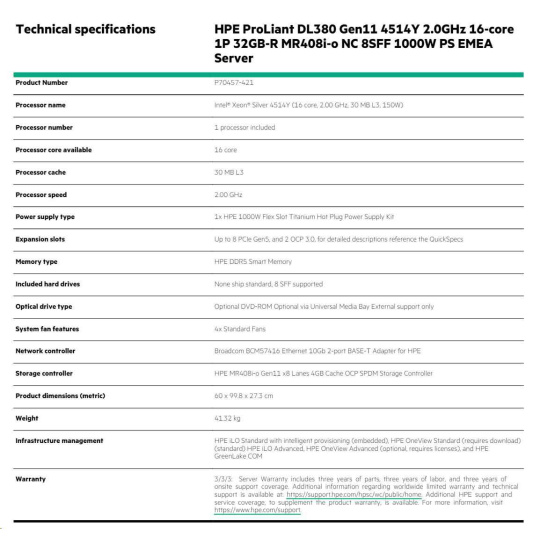 HPE PL DL380g11 4516Y+ (2.2G/24C) 2x32G (p64706) MR408i-o/4G 2x480G 2x1000W 2x10G-T Smart Choice.