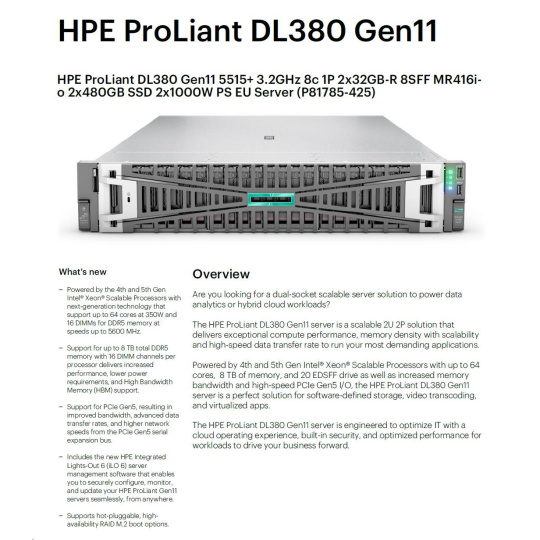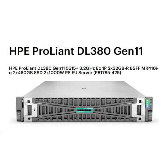 HPE ProLiant DL380 Gen11 5515+ 3.2GHz 8c 1P 2x32GB-R 8SFF MR416i-o 2x480GB SSD 2x1000W PS EU Server