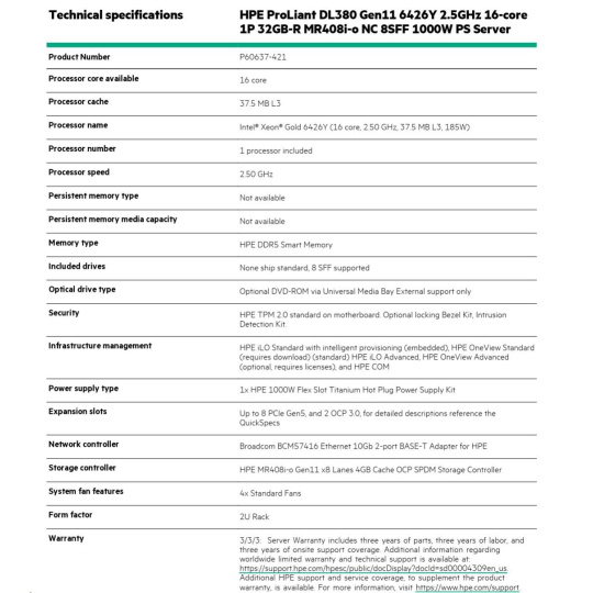 Model Name HPE PL DL380g11 6426Y (2.5/16C/38M/4800) 32G MR408i-o/4G 8-26SFF 1000Wtit 2x10G iLO6 base-T 2U NBD333
