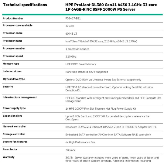 Model Name HPE ProLiant DL380 Gen11 6430 2.1GHz 32-core 1P 32GB-R NC 8SFF 1000W PS Server