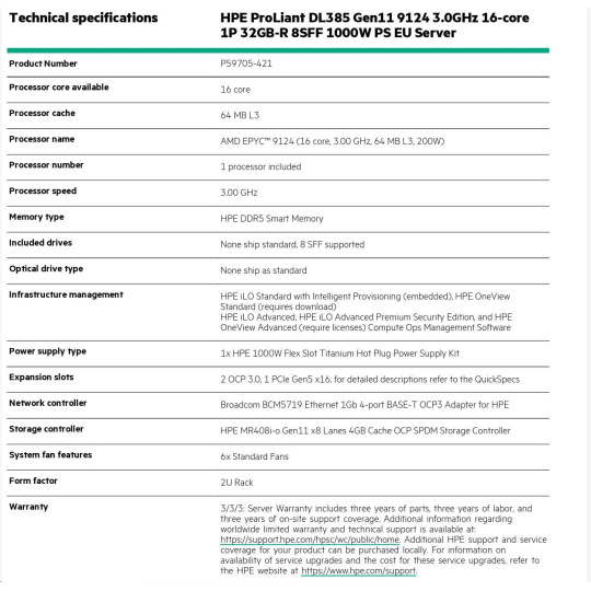 | Model Name | HPE ProLiant DL385 Gen11 9124 2.7GHz 16-core 1P 32GB-R 8SFF 800W PS Server |
