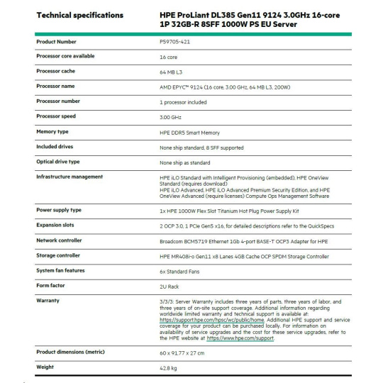 | Model Name | HPE ProLiant DL385 Gen11 9124 2.7GHz 16-core 1P 32GB-R 8SFF 800W PS Server |