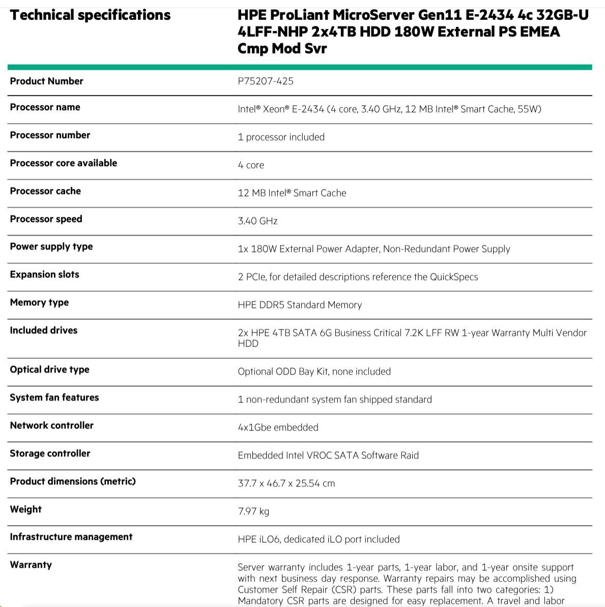 | Model Name | HPE ProLiant MicroServer Gen11 E-2434 4c 32GB-U 4LFF-NHP 2x4TB HDD 180W External PS EMEA Cmp Mod Svr |