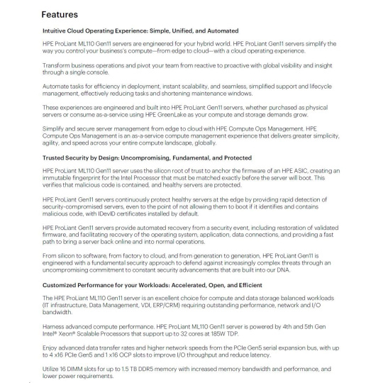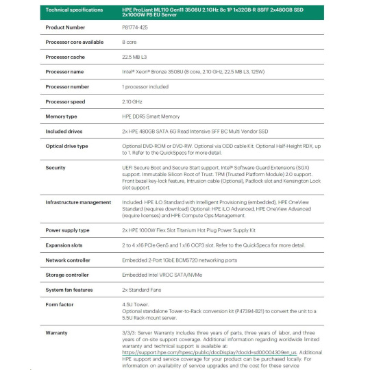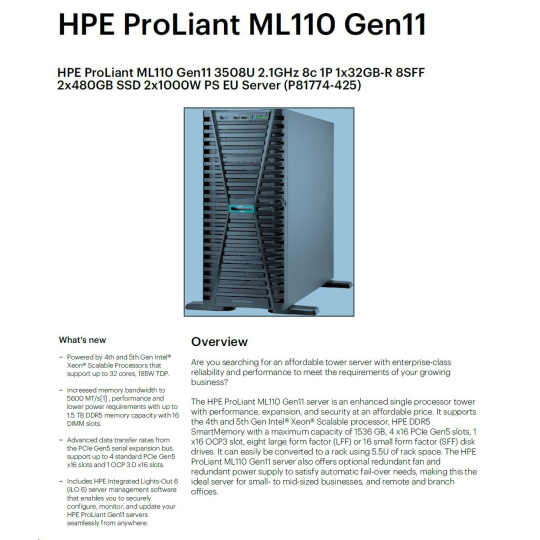 | Model Name | HPE ProLiant ML110 Gen11 3508U 2.1GHz 8c 1P 1x32GB-R 8SFF 2x480GB SSD 2x1000W PS EU Server |