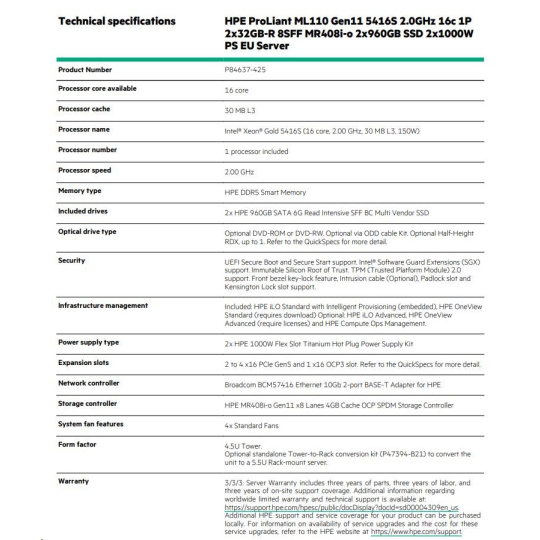 HPE PL ML110g11 5416S (2.0G/16C) 2x32G (p43328) 2x960G 2x1000W MR408i-o 8SFF 2p10GT Smart Choice