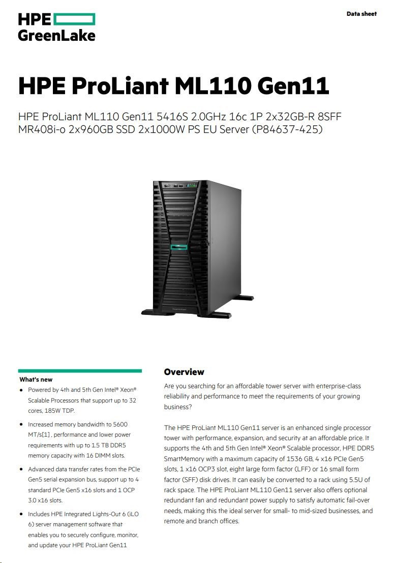 HPE PL ML110g11 5416S (2.0G/16C) 2x32G (p43328) 2x960G 2x1000W MR408i-o 8SFF 2p10GT Smart Choice