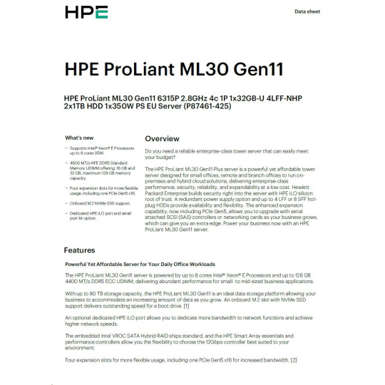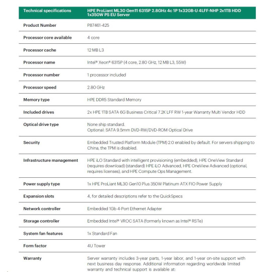 HPE PL ML30g11 6315P (2.8-5.2G/4C4T) 1x32G 2x1TB SATA 4LFF-NHP 1x350 VROC 4p1G NBD311 Smart Choice.