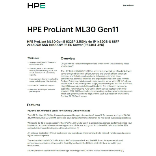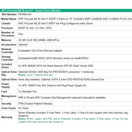 HPE PL ML30g11 6325P (3.5G/4C8T) 1x32G 2x480G SSD 8SFF VROC 1x1000W 4p1G NBD311 Smart Choice.