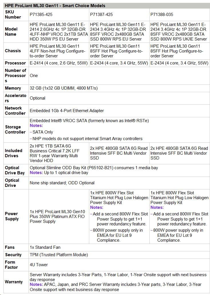 The HPE ProLiant Compute ML30 Gen11 is an enterprise class server with an affordable starting price for SMB and ROBO budgets running on-premises or hybrid-cloud workloads. Performance, security, and expansion capabilities make the ML30 a perfect fit for point of sale, file, print and save applications and security monitoring workloads needed in franchise, remote or branch office locations.