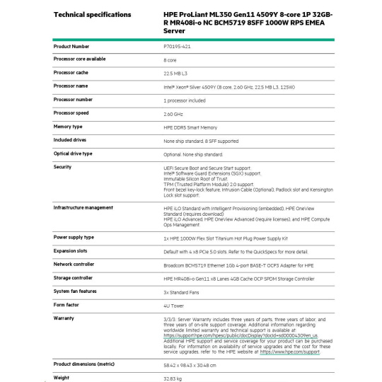 HPE PL ML350g11 4509Y (2.6G/8C) 1x32G (p64706) MR408i-o 8-24SFF 4p1G 1x1000W P70195-421 RENEW.