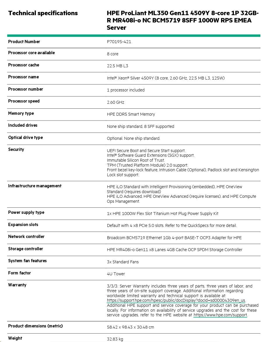 HPE PL ML350g11 4509Y (2.6G/8C) 1x32G (p64706) MR408i-o 8-24SFF 4p1G 1x1000W P70195-421 RENEW.