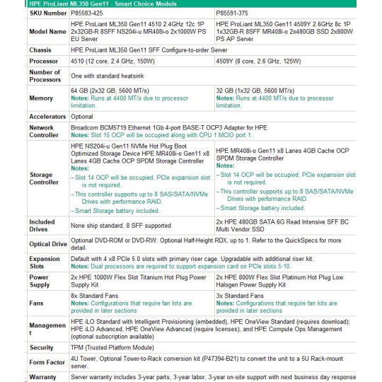 HPE PL ML350g11 4510 (2.4G/12C) 2x32G (P64706) NS204(2x480) MR408i-o 2x1000W 8SFF 4p1Gb Smart Choice.