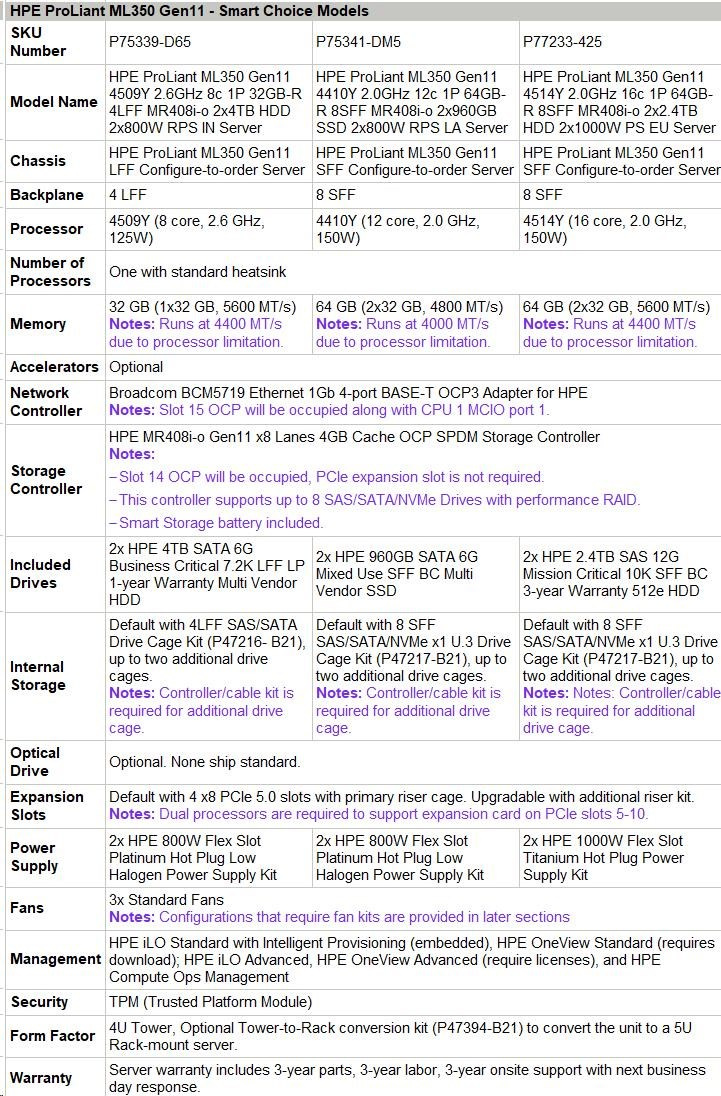 | Model Name | HPE ProLiant ML350 Gen11 4514Y 2.0GHz 16c 1P 64GB-R 8SFF MR408i-o 2x2.4TB HDD 2x1000W PS EU Server |