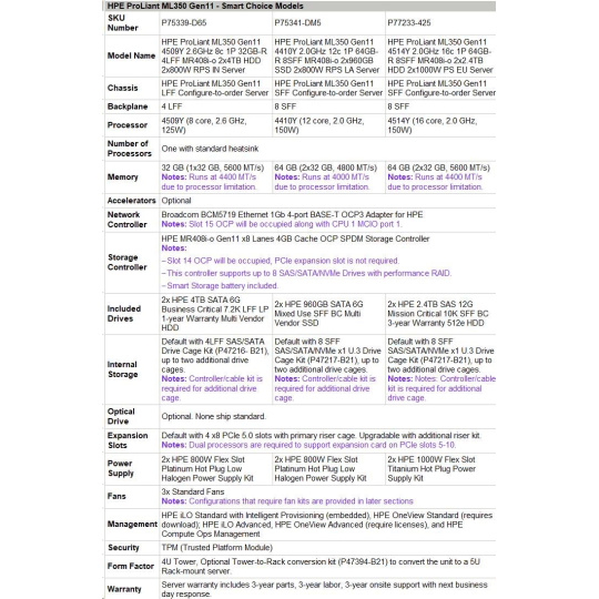 | Model Name | HPE ProLiant ML350 Gen11 4514Y 2.0GHz 16c 1P 64GB-R 8SFF MR408i-o 2x2.4TB HDD 2x1000W PS EU Server |