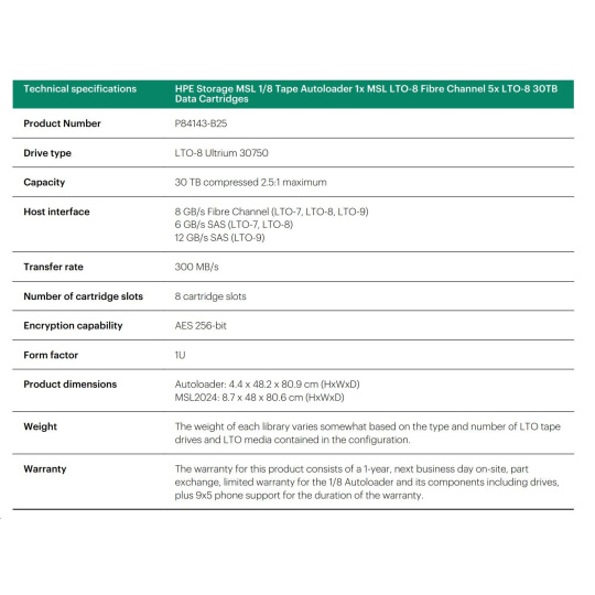 HPE Storage MSL 1/8 Tape Autoloader 1x MSL LTO-8 Fibre Channel 5x LTO-8 30TB Data Cartridges