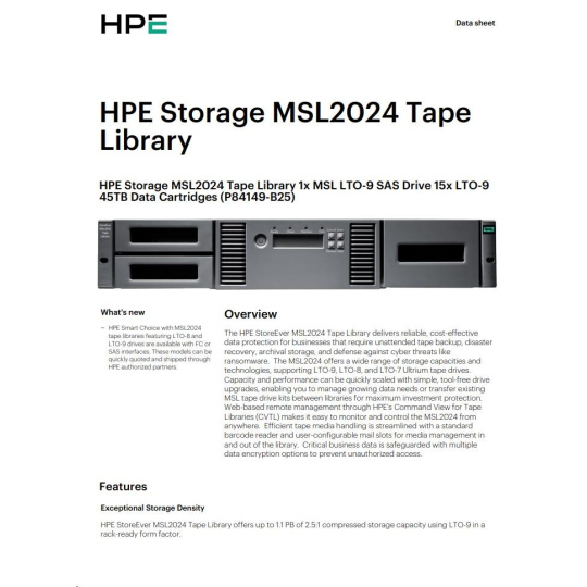 HPE Storage MSL2024 Tape Library 1x MSL LTO-9 SAS Drive 15x LTO-9 45TB Data Cartridges.