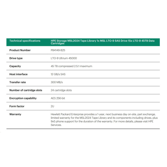 HPE Storage MSL2024 Tape Library 1x MSL LTO-9 SAS Drive 15x LTO-9 45TB Data Cartridges