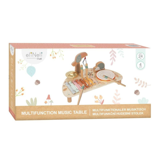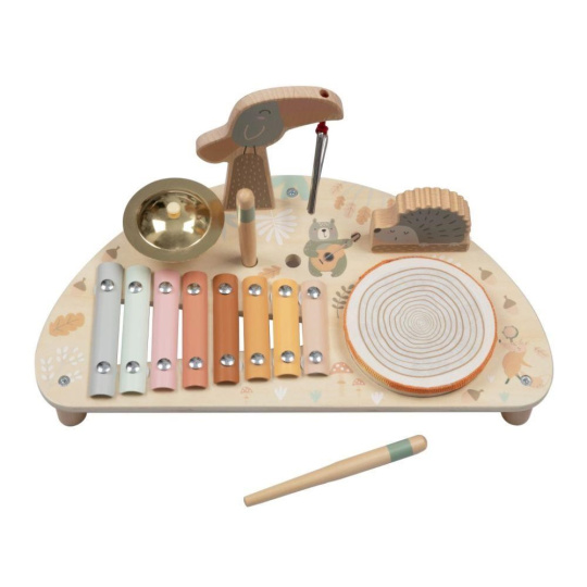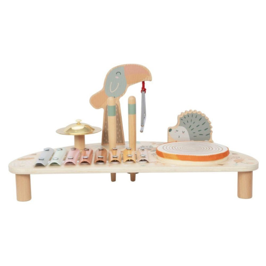 Drevený hudobný stolček pre deti so sadou 5 hudobných nástrojov na jednom mieste, s krásnou maľbou a so zvieratkami z lesa, prebudí lásku k hudbe v každom dieťati. Hudobný stolček obsahuje základné detské hudobné nástroje, ktoré stimulujú zmysly, zdokonaľujú jemnú motoriku, oboznámi deti s tým, aké zvuky ktorý nástroj vydáva, ako sa naň hraje.