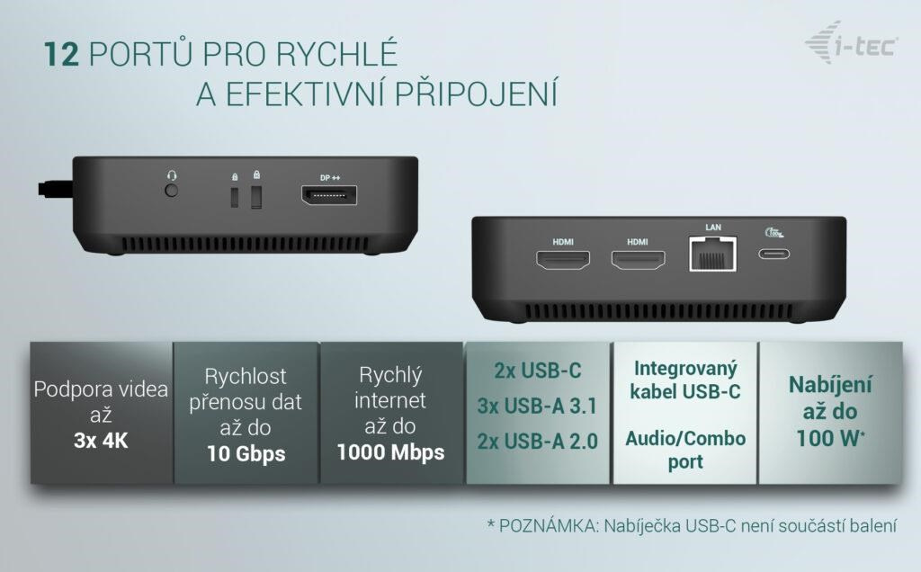 Poznámka: Napájací adaptér nie je súčasťou balenia. Dokovaciu stanicu je možné napájať originálnym adaptérom notebooku alebo je možné zakúpiť voliteľný napájací adaptér (kód i-tec: CHARGER-C100W).