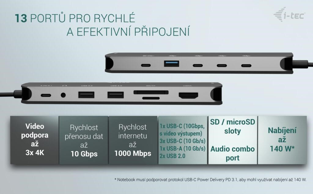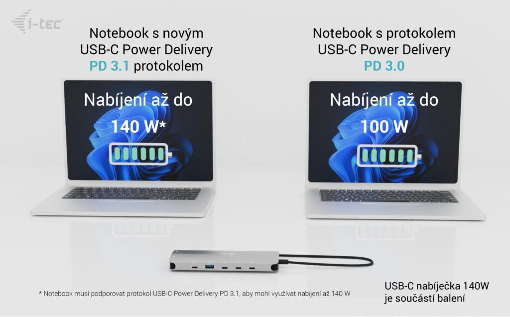 ** Ak váš notebook alebo tablet podporuje nový a moderný nabíjací protokol USB-C Power Delivery PD 3.1, dokovacia stanica ponúkne nabíjací výkon až 140 W (ak máte protokol PD 3.0, nabíjací výkon bude až 100 W).