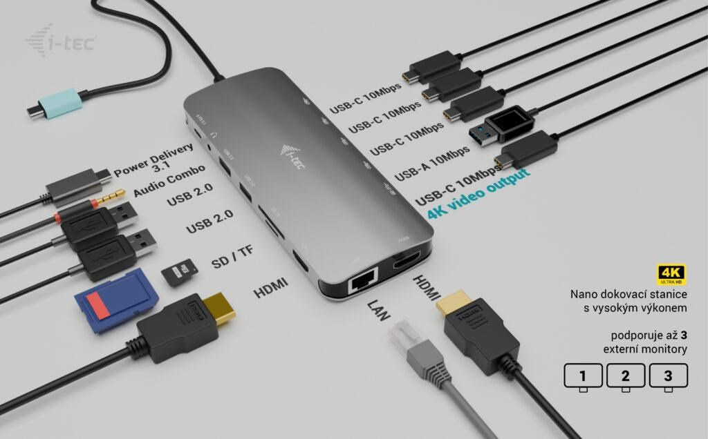 - Malá, ale výkonná kovová dokovacia stanica USB-C, na ktorú je možné pripojiť až tri externé monitory