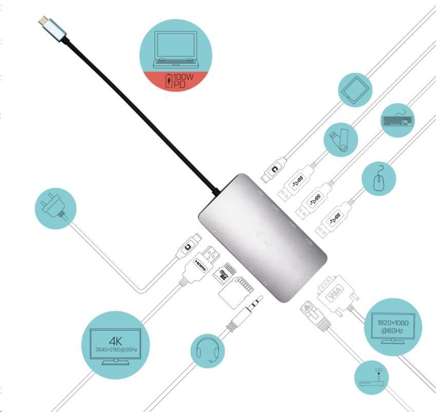 i-tec USB-C Metal Nano Dock HDMI/VGA s LAN + Nabíjačka 100W