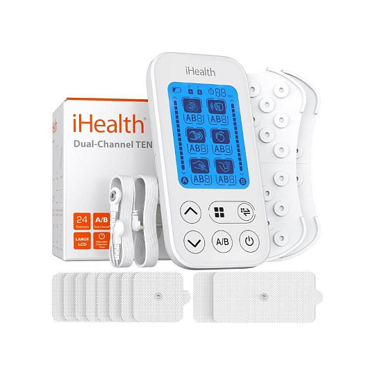 Společnost iHealth dlouhodobě patří k předním výrobcům profesionálních zdravotních zařízení. Jejich elektrostimulátor Soothe TENS je rovněž pokročilý přístroj s certifikací zdravotního zařízení navržený pro pohodlnou a efektivní domácí terapii. Disponuje dvěma nezávislými kanály, které umožňují současně ošetřovat dvě různá místa na těle, nebo si terapii užít s někým blízkým. Na výběr máte ze 24 přednastavených terapeutických programů, které napodobují různé druhy masáží (například hnětení, poklepávání, akupresura) a zaměření na řešení konkrétních problémů (např. na ztuhlé svaly, bolestivá kolena či napětí po sportu). U každého programu lze přizpůsobit jeho intenzitu – na škále od 1 do 15 úrovní – takže si můžete zvolit přesně takový impuls, který vám vyhovuje. I délku ošetření je možné nastavit dle vlastních preferencí či časových možností v rozmezí 1–30 minut. Přístroj je velmi intuitivní na ovládání – zvolený program, čas i úroveň intenzity okamžitě vidíte na velkém LCD displeji. Po skončení terapie se zařízení automaticky vypne. TENS jednotka od iHealth je napájena celkem 4 vyměnitelnými bateriemi typu AAA, které vydrží až 90 hodin provozu. To odpovídá až 6 měsícům domácí terapie při typickém 15minutové ošetření 2x denně. Používání jednotky nevyžaduje žádnou doprovodnou aplikaci – vše nastavíte přímo na přístroji bez nutnosti propojení s chytrým telefonem. V přiloženém návodu najdete přehledné vyobrazení umístění elektrod pro zmírnění bolesti a úlevy v jednotlivých tělesných partiích pro maximální efekt.Poznámka: Pacienti s implantovanými elektronickými zařízeními, jako jsou kardiostimulátory, život udržující lékařské přístroje (např. umělé srdce nebo plíce) nebo elektrokardiografy, by toto zařízení neměli používat.