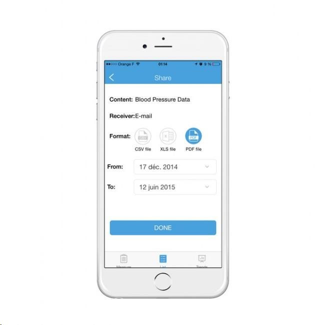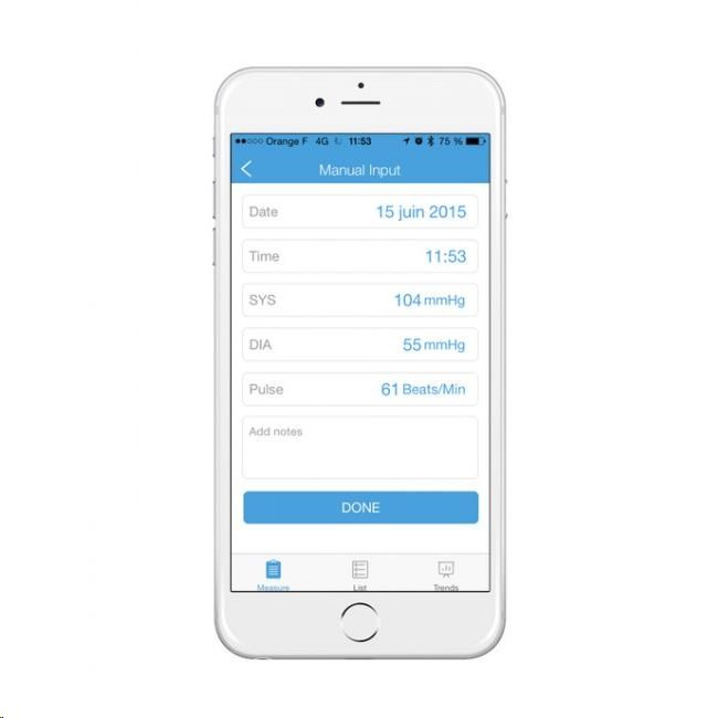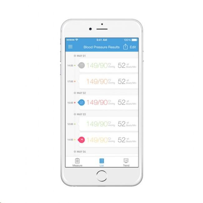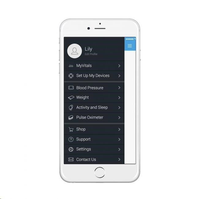 Môžete však bezdrôtovo a v priebehu niekoľkých sekúnd synchronizovať iHealth Track cez Bluetooth 4.0 s aplikáciou iHealth MyVitals vo vašom smartfóne a cloude výrobcu. Aplikácia zaznamenáva neobmedzenú históriu a umožňuje vám zdieľať výsledky s rodinou alebo lekárom.