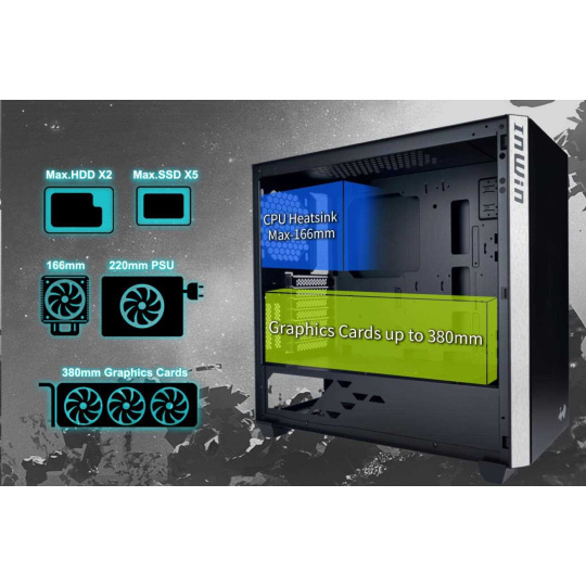Model 216 poskytuje vysokú flexibilitu pri chladiacom výkone. Celkovo môže podporovať až 6 ventilátorov súčasne, čo zvyšuje chladiaci výkon a dokáže vytvoriť úžasnú hernú zostavu!