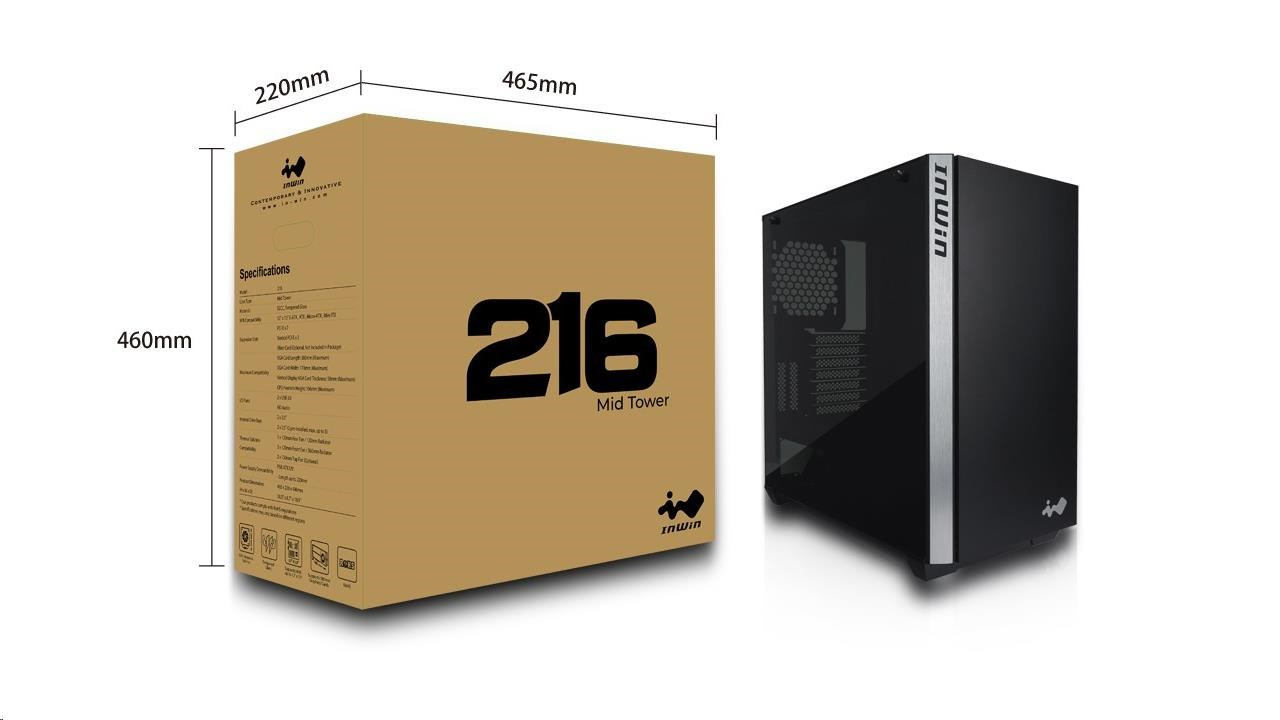 IN WIN case 216, mid tower, 220mm PSU, 166mm ventilátor,, 2xHDD, 5xSSD, 2x USB 3.0 / HD Audio / čierna