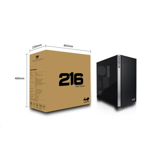 IN WIN case 216, mid tower, 220mm PSU, 166mm ventilátor,, 2xHDD, 5xSSD, 2x USB 3.0 / HD Audio / čierna