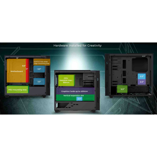 | kompatibilita M/B | 12" x 11" E-ATX, ATX, Micro-ATX, Mini-ITX *Poznámka: 12''' x 9.podporované 6'' MB s voliteľnou klietkou na disky. |