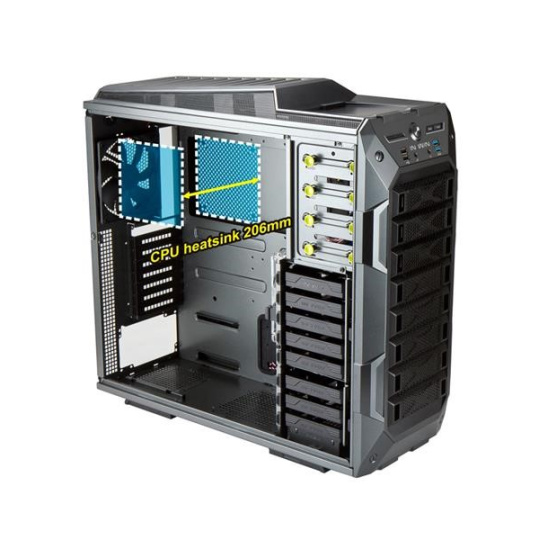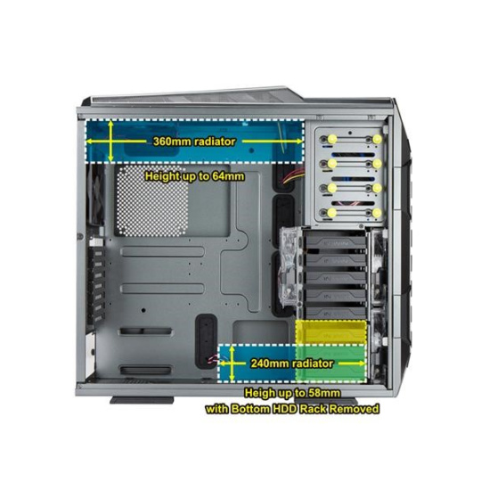 Aby ste si mohli vychutnať maximálny výkon svojho počítača, je možné do skrine zabudovať dve jednotky vodného chladenia, jednu v hornej časti s dĺžkou až 360 mm a druhú v spodnej časti s dĺžkou až 240 mm. Do skrine možno umiestniť až 10 ventilátorov (vrátane 4 predinštalovaných) na optimálnu cirkuláciu vzduchu.