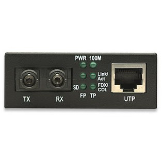 Multimediálny konvertor Fast Ethernet 10/100Base-TX na 100Base-FX (ST) Multi-Mode, 2 km (1.24 míľ) Farba: čierna -Rýchlosť prenosu dát: 100 Mb/s -Jeden port 10/100Base-TX RJ45, maximálna vzdialenosť 100 m / 300 ft. -RJ45 port s podporou Auto MDI/MDI-X a automatickým vyjednávaním -Jeden 100Base-FX viacrežimový optický ST duplexný port -Podpora vzdialenosti optických vlákien: do 2 km / 1.24 míľ (62.5/125 alebo 50/125 µm kábel) -Vlnová dĺžka: 1310 nm -Riadenie toku -Stavové LED diódy pre napájanie a Link/TX pre oba porty -Externý napájací adaptér, 5 V DC..