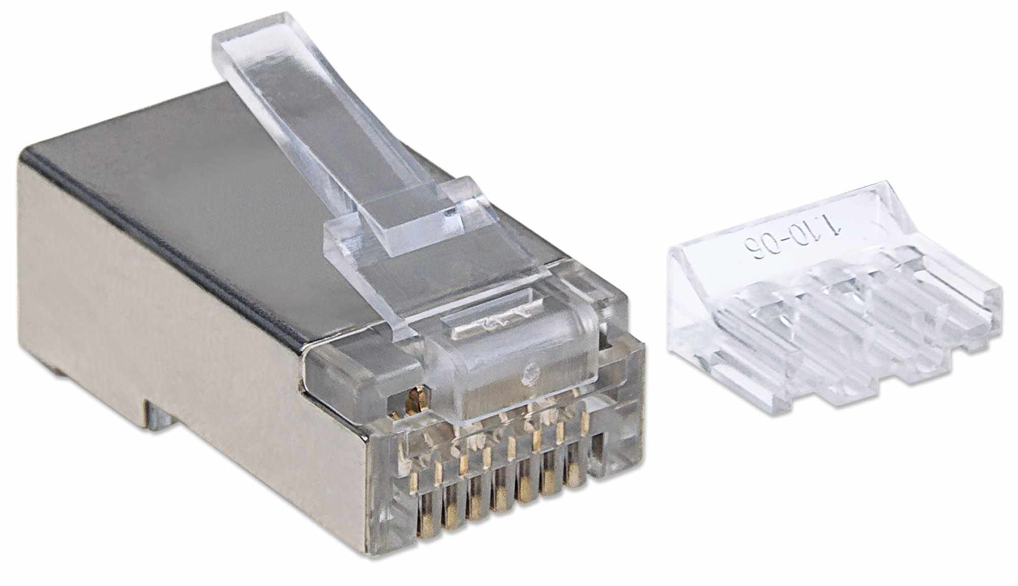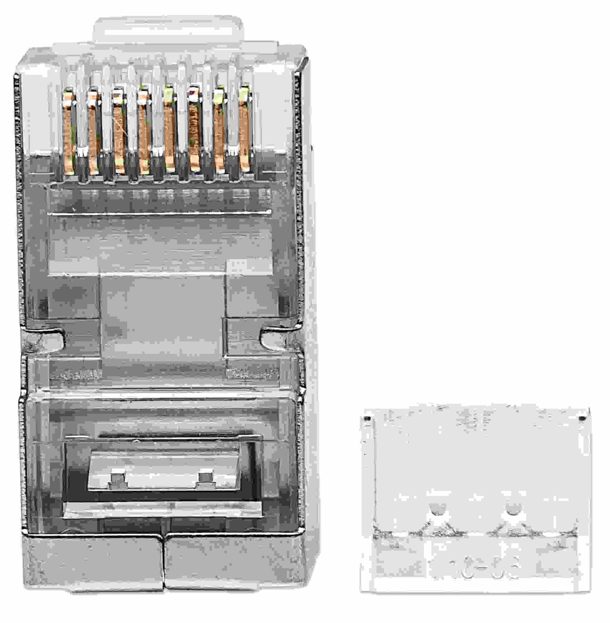 -15 µ pozlátených kontaktov -Trojkolíkový terminál pre pevné vodiče -Pasuje na okrúhly kábel -Pre aplikácie so stínenou krútenou dvojlinkou -Štandardný dizajn 8P8C, kompatibilný so všetkými sieťovými pripojeniami RJ45 -Plne kompatibilný s aplikáciami kategórie 3, 4, 5, 5e, 6 a 6A..