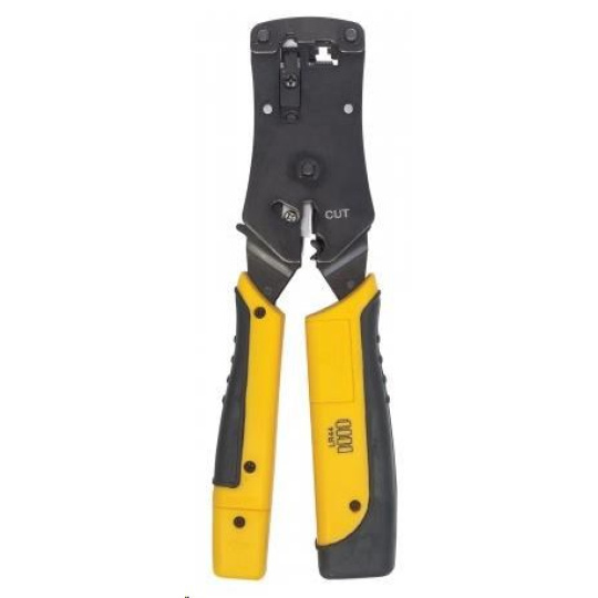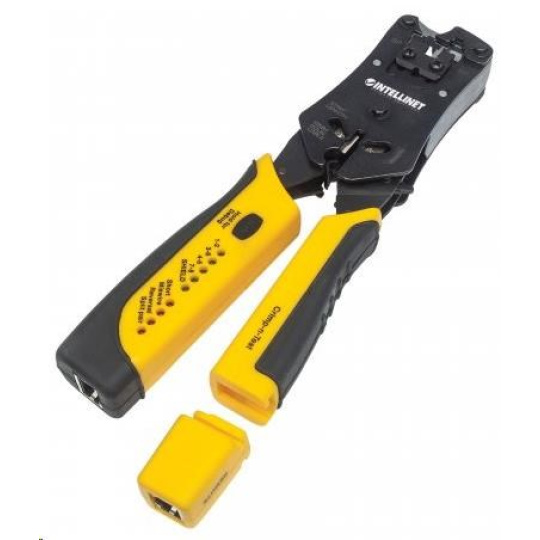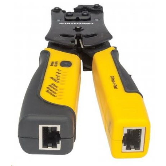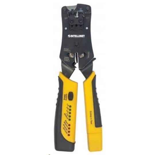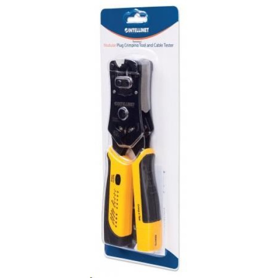 -Odstraňuje a strihá sieťové a telefónne káble -Odstraňuje zástrčky RJ45, RJ11, RJ12 a RJ22 -Testuje káble Cat3, Cat5, Cat5e, Cat6 a Cat6a -Deväť LED diód zobrazuje výsledky testov -Demontovateľný, zacvakávací diaľkový ovládač Rozmery -Dĺžka: 220 mm (8.6 in.) -Hmotnosť: 513 g (1.13 lbs) Obsah balenia -Univerzálny modulárny nástroj na lisovanie zástrčiek a káblový tester -Batérie nie sú súčasťou balenia (vyžaduje jednu 6 V A544 alebo štyri gombíkové batérie LR44)..