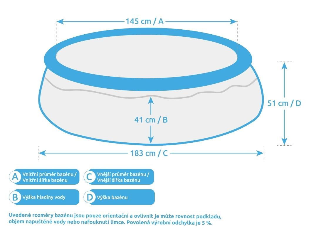 Uvedené rozmery bazénu sú iba orientačné a ovplyvniť ich môže rovnosť podkladu, objem napustenej vody alebo nafúknutie límca. Povolená výrobná odchýlka je 5 %.