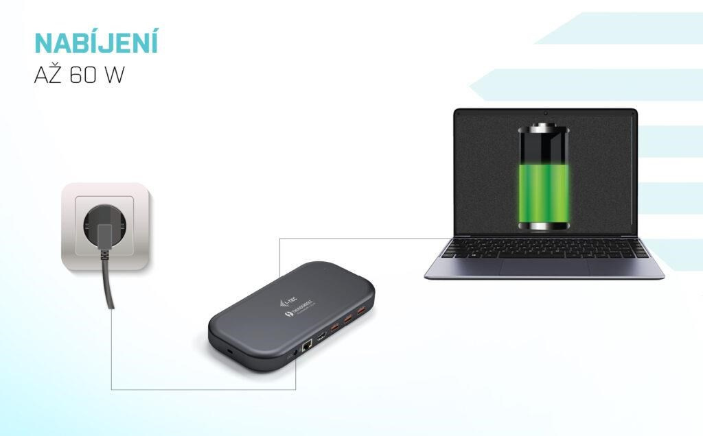 - Poskytuje až 60W Power Delivery pre kompatibilné notebooky a tablety s rozhraním USB4, USB-C a Thunderbolt. Hostiteľské zariadenie musí podporovať USB-C Power Delivery.