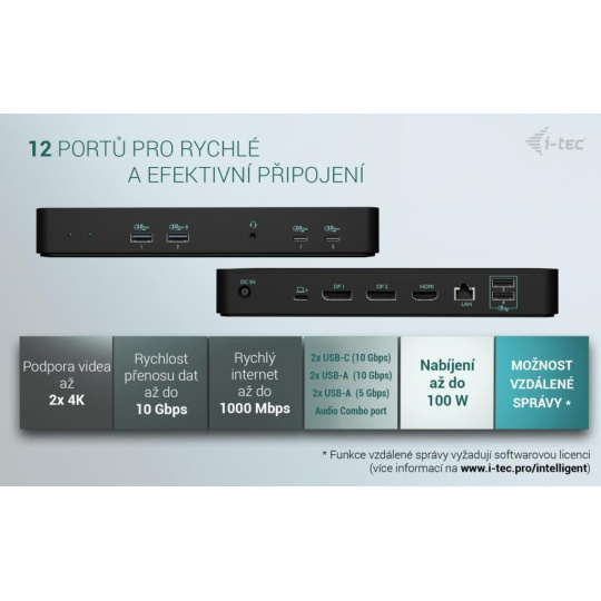 - Tato výkonná a univerzálna dokovacia stanica je vybavená dedikovaným LAN portom, ktorý umožňuje plnú vzdialenú správu – až na úroveň jednotlivých portov – odkadiaľkoľvek. Správa funguje aj bez pripojenia k hostiteľskému zariadeniu – postačuje napájanie a pripojenie do LAN.