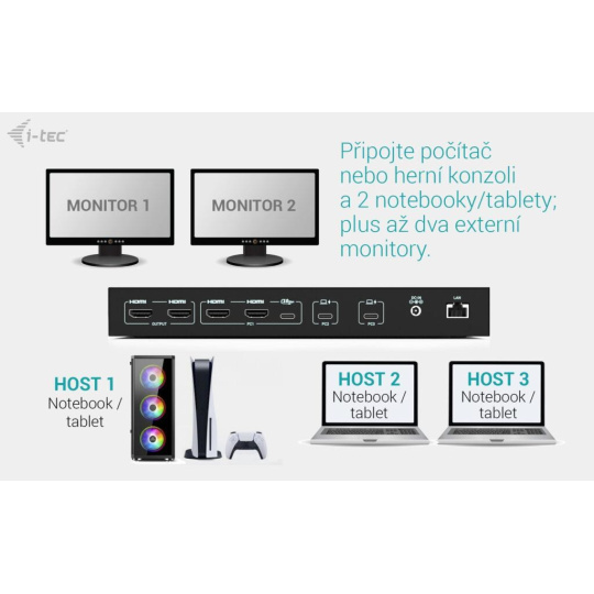 i-tec USB-C KVM Docking station for 3 Hosts, Dual Display, Power Delivery 1x 92W/2x 65W