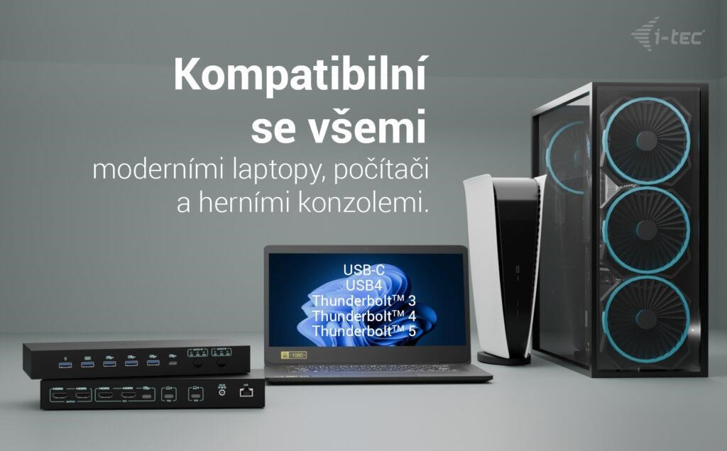 - Je plne kompatibilná so všetkými notebookmi vybavenými portami USB-C, USB4 alebo Thunderbolt 3/4/5. PC alebo herná konzola môžu byť pripojené cez 1–2× HDMI a USB.