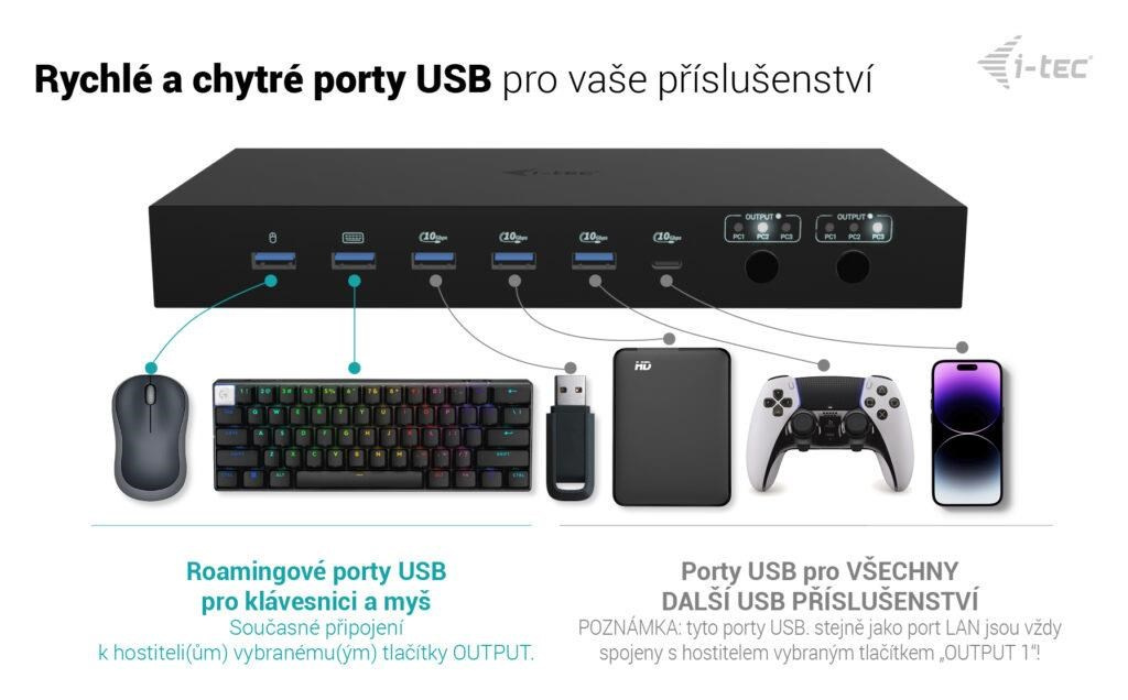 - Podpora až 3 hostiteľských zariadení (2× notebook/tablet + 1× herná konzola/PC)