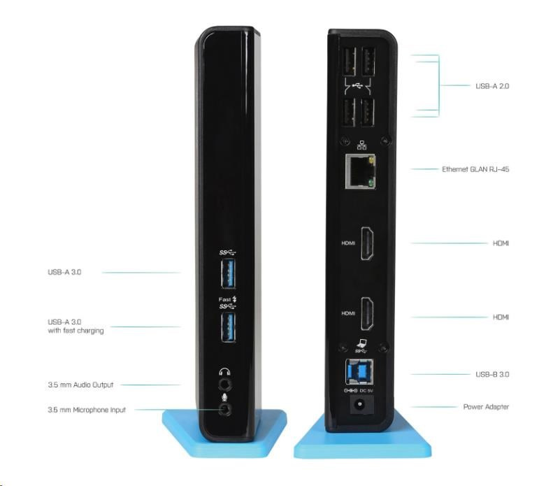 Stanica podporuje až 2x externý monitor, ktorý môžete pripojiť cez porty HDMI. 6x port USB, spoľahlivé a rýchle pripojenie k internetu vďaka integrovanému portu LAN a podpora zvukového vstupu a výstupu.