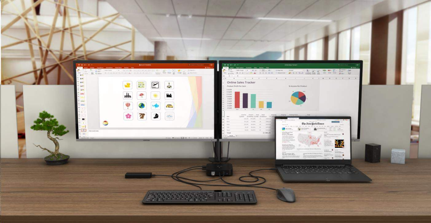 Kancelárska dokovacia stanica USB-C, ktorá podporuje až 2× externý monitor s rozlíšením 4K. Stanica je kompatibilná s akýmkoľvek notebookom vybaveným portom USB-C alebo Thunderbolt 3. 6x port USB, spoľahlivé a rýchle pripojenie k firemnej sieti vďaka integrovanému portu LAN, napájanie až do 100 W a podpora inštalácie za monitor, to všetko robí z tejto dokovacej stanice ideálneho spoločníka pre profesionálov.