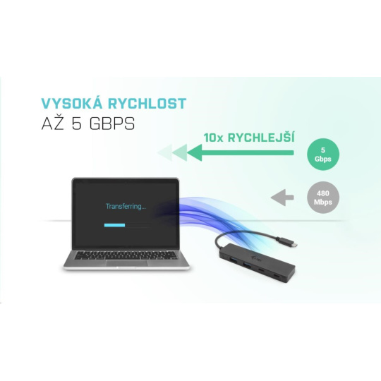 S týmto rozbočovačom získate 4 ďalšie USB: dve štandardné USB 3.0 a dva porty USB-C. Pripojte externú klávesnicu a myš, prenášajte dáta alebo filmy z flash disku USB rýchlosťou až 5 Gb/s alebo nabíjajte mobilné zariadenia (štandardná rýchlosť USB 0.9A).