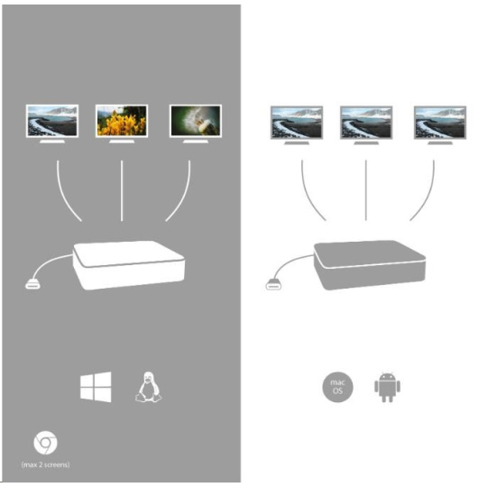 Ergonomická kovová dokovacia stanica USB-C, ktorá podporuje až 3 externé monitory. Stanica je kompatibilná s akýmkoľvek notebookom vybaveným portom USB-C alebo Thunderbolt 3 (60 cm dlhý integrovaný kábel je dostatočne dlhý na pripojenie všetkých notebookov s obrazovkou do 15"). Táto dokovacia stanica ponúka 4 porty USB, spoľahlivé a rýchle pripojenie k firemnej sieti vďaka integrovanému portu LAN a výkon až 85 W. Vďaka svojej konštrukcii sa dá použiť aj ako stojan na notebook.