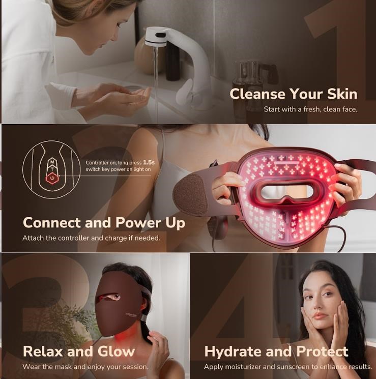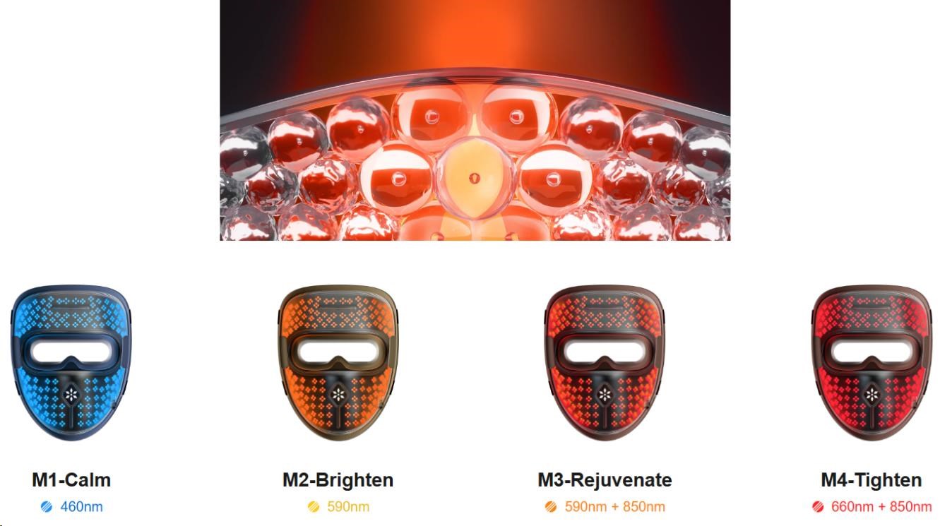 - Čtyři klinicky ověřené vlnové délky pro komplexní péči o pleť: modrá, jantarová, červená a blízká infračervená.