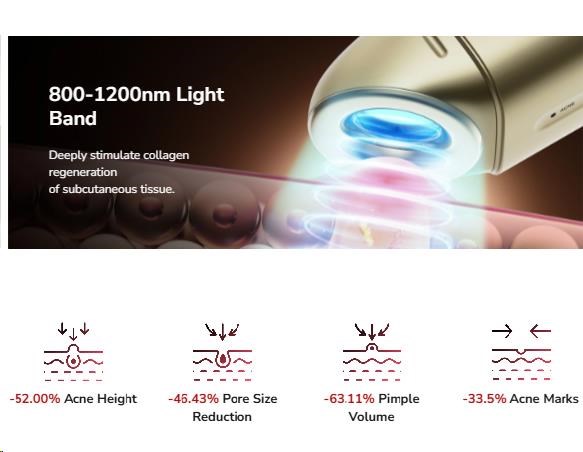 - Dvojitá rázová vlna svetla: Kombinuje dve pásma (400-600nm & 800-1200nm) pre komplexný účinok – ničenie baktérií a reguláciu mazu.
