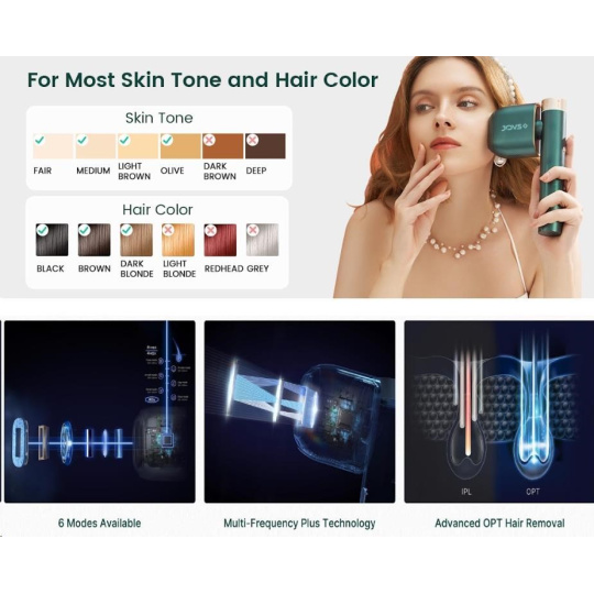 *Toto zariadenie môže používať ktokoľvek s typmi pleti I až V na Fitzpatrickovej stupnici. Ak máte veľmi tmavý odtieň pleti (typ VI), toto zariadenie prosím nepoužívajte. JOVS Pro II je možné použiť na ošetrenie tmavých blond až čiernych typov chlpu, ale nie na svetlé blond, zrzavé alebo šedivé chlpy.