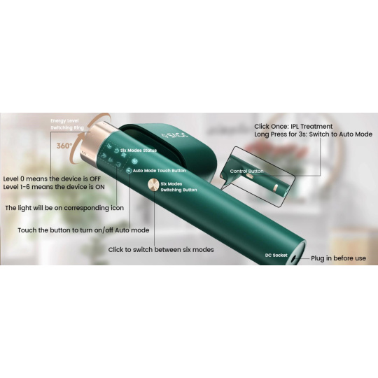 - Presné cielenie na každú partiu: 6 špecializovaných režimov pre tvár, ruky, nohy, podpazušie a oblasť bikín s 6 úrovňami intenzity.